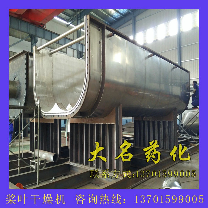 空心軸上密集排列著楔型中空漿葉,熱介質(zhì)經(jīng)空心軸流經(jīng)漿葉。單位有效容積內(nèi)傳熱面積很大,熱介質(zhì)溫度從-40℃到320℃,可以是水蒸汽,也可以是液體型:如熱水、導(dǎo)熱油等。間接傳導(dǎo)加熱,沒(méi)有攜帶空氣帶走熱量,熱量均用來(lái)加熱物料。熱量損失僅為通過(guò)器體保溫層向環(huán)境的散熱。楔型漿葉傳熱面具有自清潔功能。物料顆粒與楔型面的相對(duì)運(yùn)動(dòng)產(chǎn)生洗刷作用,能夠洗刷掉楔型面上附著物料,使運(yùn)轉(zhuǎn)中一直保持著清潔的傳熱面。漿葉干燥機(jī)的殼體為Ω型,殼體內(nèi)一般安排二到四根空心攪拌軸。殼體有密封端蓋與上蓋,防止物料粉塵外泄而充分發(fā)揮作用。